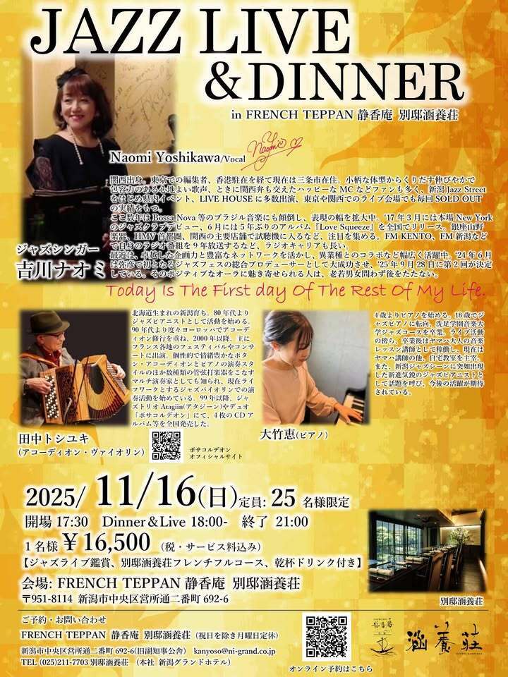 #吉川ナオミ #よしかわなおみ #ヨシカワナオミ #別邸涵養荘 #ジャズ #ジャズライブ #ライブ #ジャズライブディナー #ライブディナー #ディナー #フレンチ #田中トシユキ #タナカトシユキ #アコーディオン #ヴァイオリン #大竹恵 #ピアノ #ジャズピアノ #ジャズピアニスト